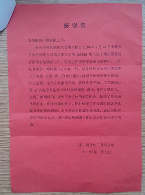 近日我公司(sī)售後服務工程師將兩封(fēng)措辭真(zhēn)摯、發(fā)自肺腑的感謝信放在91福利视频在线观看公司領導的辦公桌上。這封信(xìn)來自兩名客戶,信中飽含著對江(jiāng)蘇91福利视频在线观看幹(gàn)燥設備有限公司服務(wù)的深情讚(zàn)揚。江蘇91福利视频在线观看幹燥設備有限公司售後服務工程師唐全偉為其提供(gòng)的無微不至(zhì)、體貼周到的售後服務,令客戶^感動。