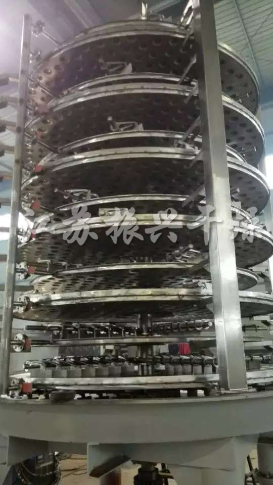 盤式連續幹燥機是一種高效的傳導型連續幹燥設(shè)備,這次生產的22層300型大型真空圓盤幹燥機適用性強,通過調整料(liào)層厚度、主軸轉速、耙臂數量、耙葉形式和尺寸可使幹(gàn)燥過程達到較佳。每層幹燥盤皆可單獨通入熱介質(zhì)或冷介質,對物料進行加熱或冷卻,物料溫度控製準(zhǔn)確、容易。物(wù)料(liào)的停留時間可以^調整。物料流向單一,無返混現象,幹燥均勻、質量穩定、不(bú)需再混合