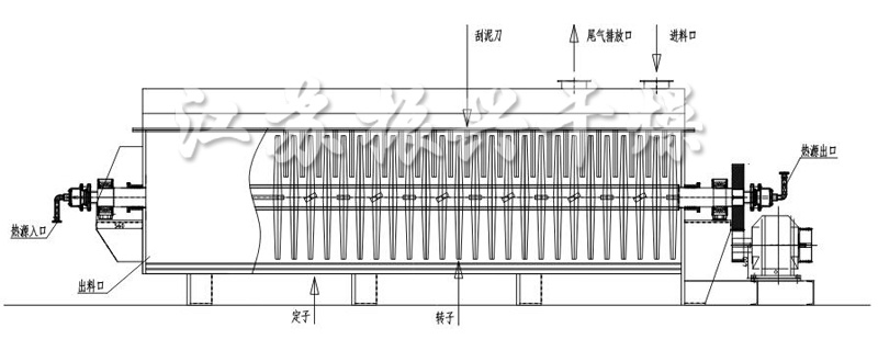 (1) . 設備結構緊湊,汙泥烘幹機裝置占地麵積小。幹燥所需熱量主要是由排列於空 心軸上的空心葉片壁麵提供,而夾套(tào)壁麵的傳熱量隻占少部分。所以單 位體積設備的傳熱(rè)麵(miàn)大,可節省(shěng)設備占地麵積,減少基建投資。