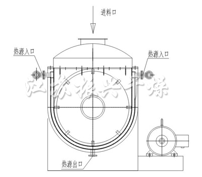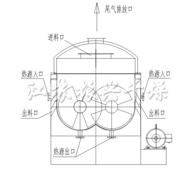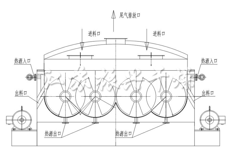 空心(xīn)軸上密集排列著空心(xīn)葉片,熱介質經空(kōng)心軸流經葉片。單位有效容積 內傳熱麵積很大(dà)(一般單台雙軸槳葉麵積≤ 200m2 左右;單台四軸槳葉麵積 ≤ 400m2 左右),熱介質溫度從60~320℃,可以是水蒸(zhēng)氣,也可以是液體型: 如熱(rè)水、導熱油等。間接傳導加熱,熱(rè)量(liàng)均用來加熱(rè)物料,熱量(liàng)損失僅為通 過器體保(bǎo)溫層和排濕向環境(jìng)散(sàn)熱。